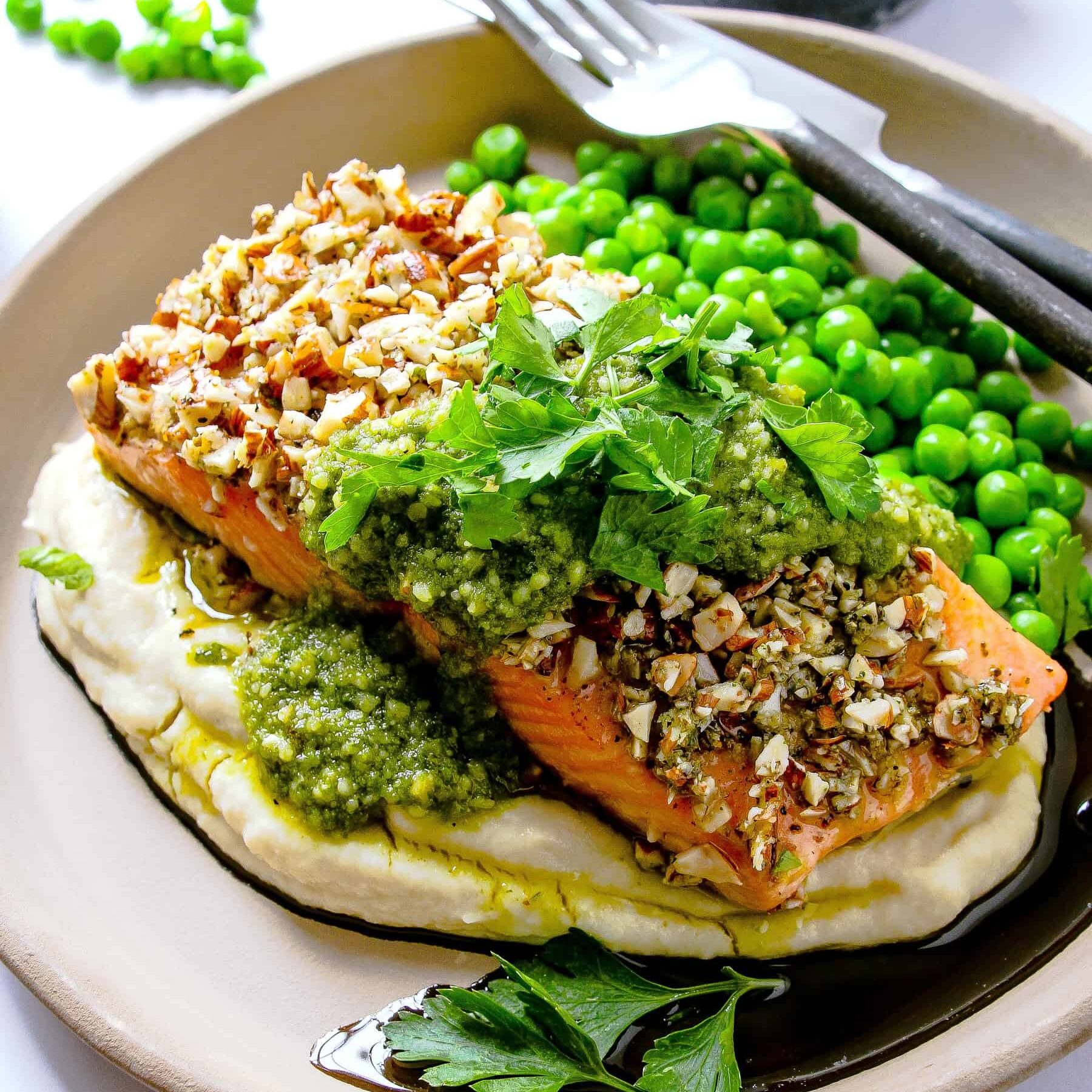 1 Preheat the oven to 425 degrees. 2 In a small bowl, mix together the chopped almonds, parsley, lemon zest, salt, and pepper. Drizzle in the olive oil and stir until the crumbs are evenly coated. Set aside. 3 Place the salmon fillets, skin side down, on a parchment paper lined baking sheet. 4 Generously brush the top of the filets with dijon mustard. Season the top with salt and pepper. Press the almond mixture top of the mustard on each salmon filet in a thick layer. 5 Baked for 12-15 minutes, until the salmon is opaque all the way through. 6 Remove from the oven and cover with aluminum foil. Rest for 5 to 10 minutes.View original recipe